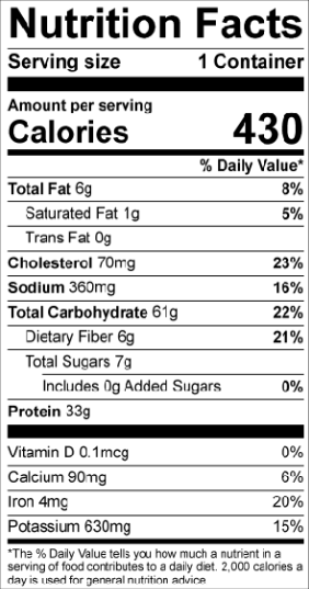 Peel label from tray; puncture film with a fork to vent. Microwave on high, from refrigerated, 2.5 - 3.5 minutes and until meal reaches internal temperature of 165°F. Increase heating time when microwaving from frozen. Let meal stand 1 minute. Peel film carefully, the meal will be hot. Stir and enjoy!
