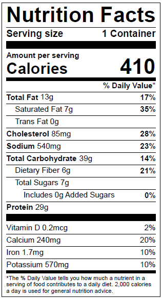 Peel label from tray; puncture film with a fork to vent. Microwave on high, from refrigerated, 2.5 - 3.5 minutes and until meal reaches internal temperature of 165°F. Increase heating time when microwaving from frozen. Let meal stand 1 minute. Peel film carefully, the meal will be hot. Stir and enjoy!