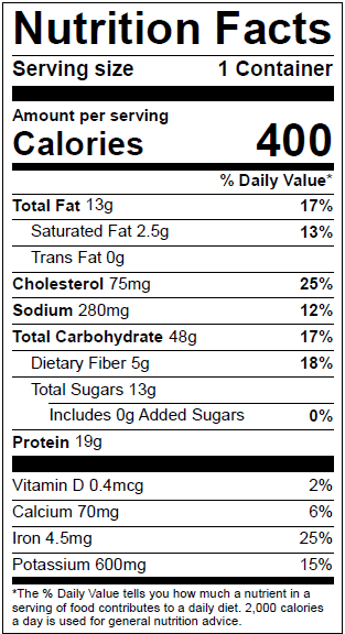 Peel label from tray; puncture film with a fork to vent. Microwave on high, from refrigerated, 2.5 - 3.5 minutes and until meal reaches internal temperature of 165°F. Increase heating time when microwaving from frozen. Let meal stand 1 minute. Peel film carefully, the meal will be hot. Stir and enjoy!
