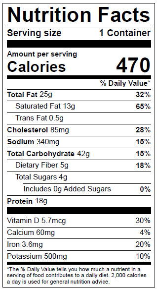 Peel label from tray; puncture film with a fork to vent. Microwave on high, from refrigerated, 2.5 - 3.5 minutes and until meal reaches internal temperature of 165°F. Increase heating time when microwaving from frozen. Let meal stand 1 minute. Peel film carefully, the meal will be hot. Stir and enjoy!