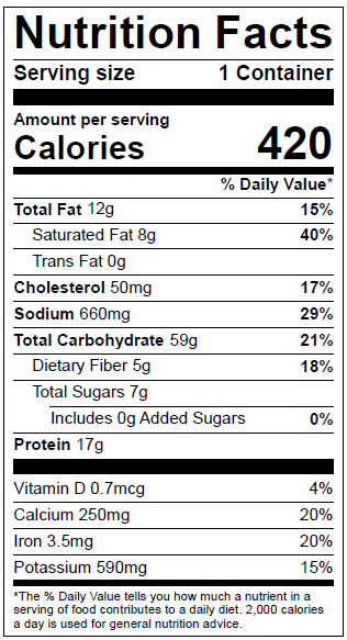 Peel label from tray; puncture film with a fork to vent. Microwave on high, from refrigerated, 2.5 - 3.5 minutes and until meal reaches internal temperature of 165°F. Increase heating time when microwaving from frozen. Let meal stand 1 minute. Peel film carefully, the meal will be hot. Stir and enjoy!